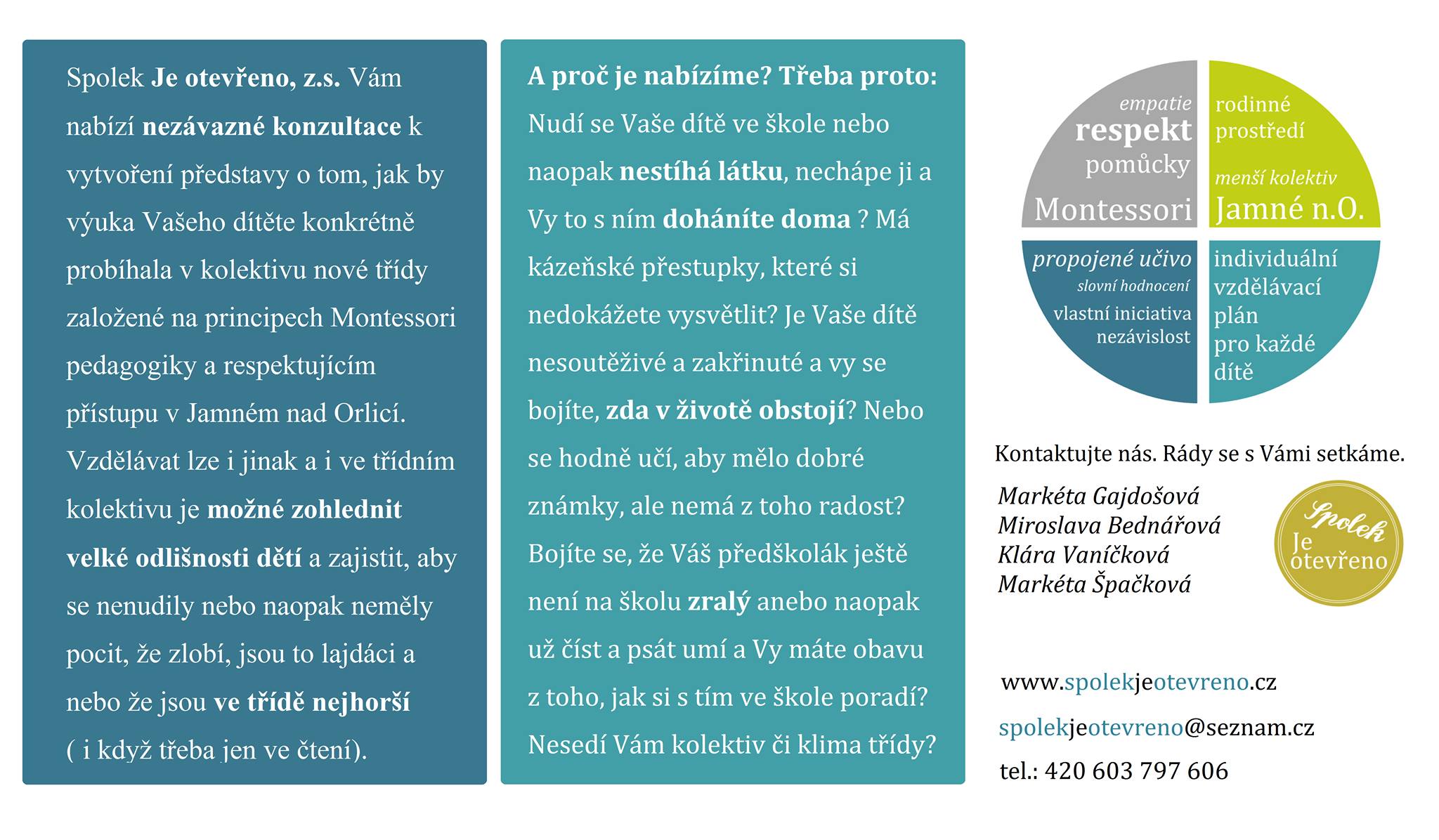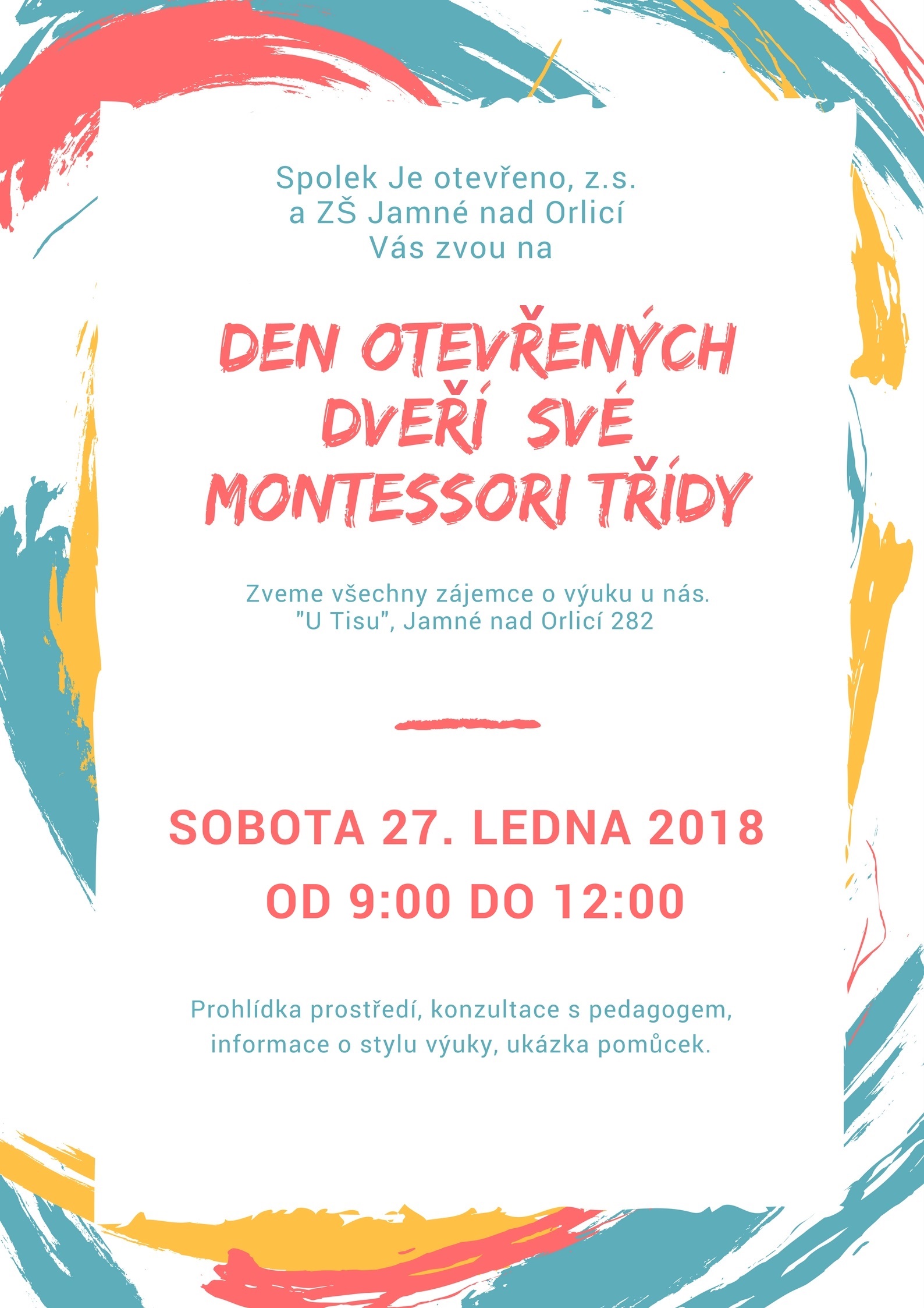 Zájemcům o docházku do námi zřízené třídy ZŠ Jamné nad Orlicí nabízíme možnost jít se podívat do výuky. Je to jedinečná příležitost, díky které na vlastní kůži zažijete způsob výuky, kterým se u nás pracuje. Uvidíte, jak se činí naši současní žáci, a zároveň si prohlédnete i prostory tříd a jejich zázemí.