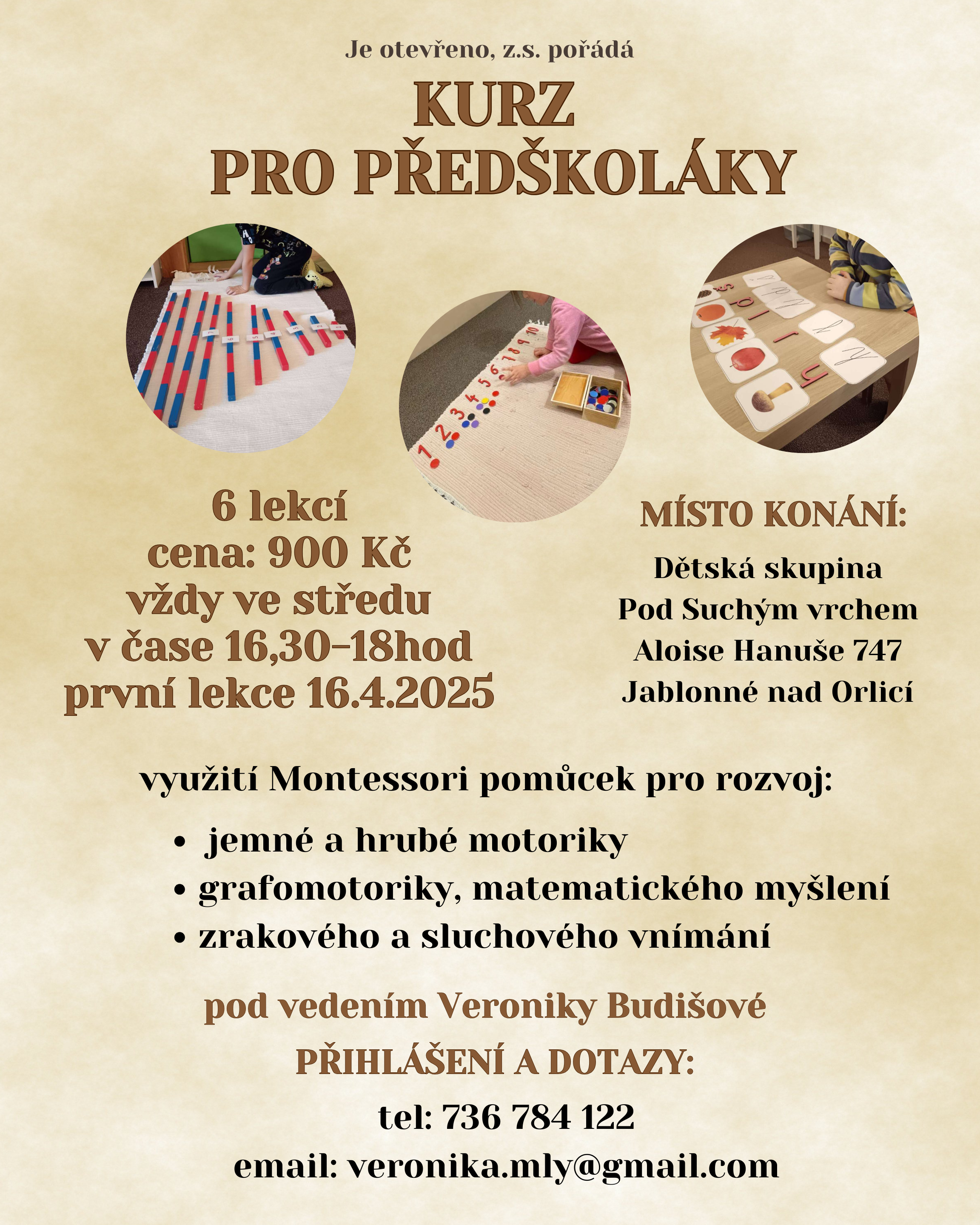 Rozhodli uspořádat sérii 6 lekcí předškolní přípravy pro děti, které by měly nastoupit školní docházku ve školním roce 2025/2026. Nabízíme intenzivní všestranný rozvoj Vašeho dítěte ve specifickém prostředí, kterým jsou prostory a vybavení Dětské skupiny Pod Suchým vrchem v Jablonném nad Orlicí. Kurz bude probíhat pod vedením Veroniky Budišové, která je absolventkou Diplomovaného Montessori kurzu pro věk 3-6 let a průvodkyní/chůvou naší DS. V současné době je na rodičovské dovolené.